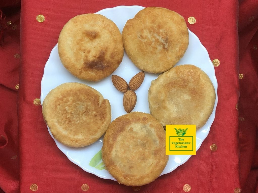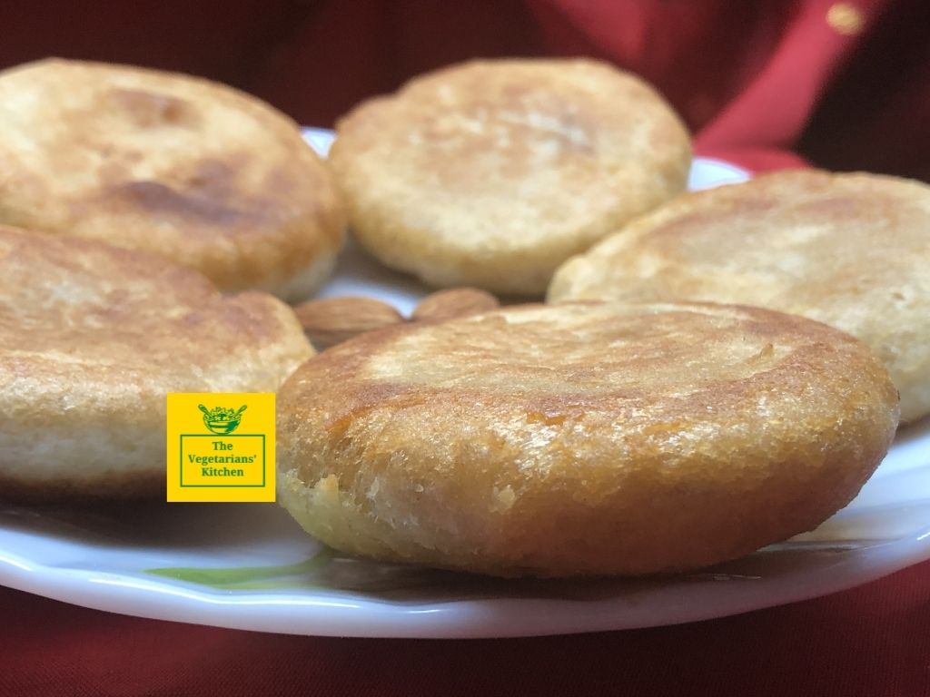 Heat oil in a shallow pan such that it covers the pan’s base. Place your stuffed dough ball in the pan, with the smooth side on top. After a few seconds, when it seems like the dough has slightly stiffened, flip the ball.