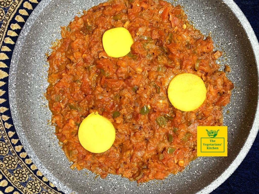 Uncover your Shakshuka pan and place the potato pieces on the gravy. (If you have extra potatoes, mash them and sprinkle on the gravy for the pav bhaji effect.) Cover and let the Shakshuka simmer for a couple more minutes till you are sure the potatoes have completely cooked.