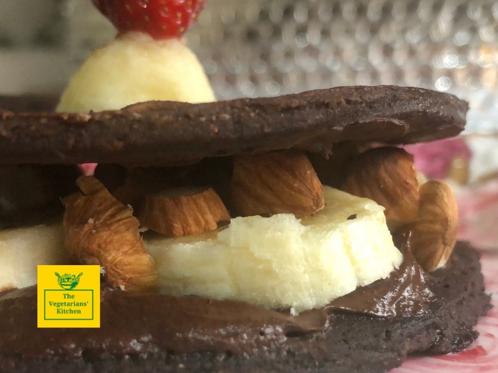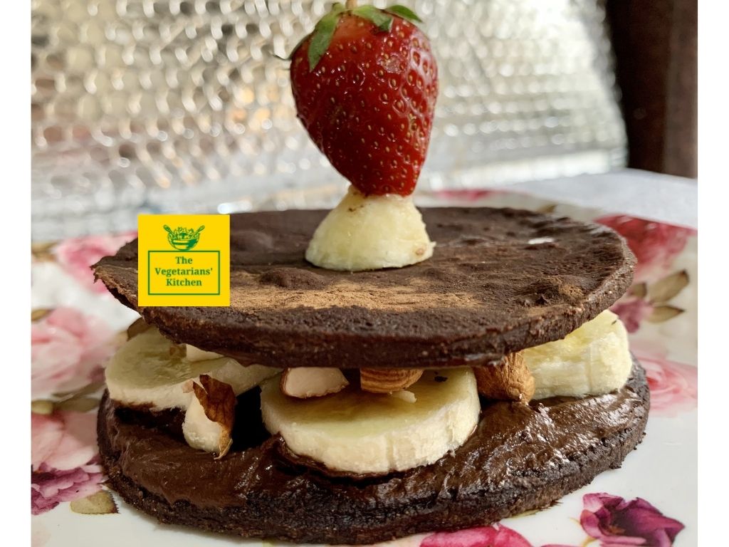 While the four pancakes cool, take a small bowl and mix the cocoa powder, sugar and water to make a smooth paste. If you have melted chocolate, you can skip the water and only mix it with sugar. You can even try a combination of chocolate, cocoa powder and sugar. Really, the end result needs to be a sweet smooth paste; you can use your imagination to get there! If you are not vegan, you can add a bit of milk instead of the water. Vegans could try plant-based mylks instead. There are several options and you can choose based on your taste buds’ preference.