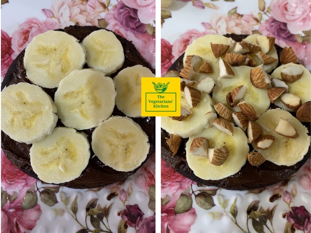 Take one of the pancakes and brush one side of it with the cocoa/chocolate paste. Then layer it with a few slices of the banana. Then sprinkle some of the chopped almonds on top of the banana slices.